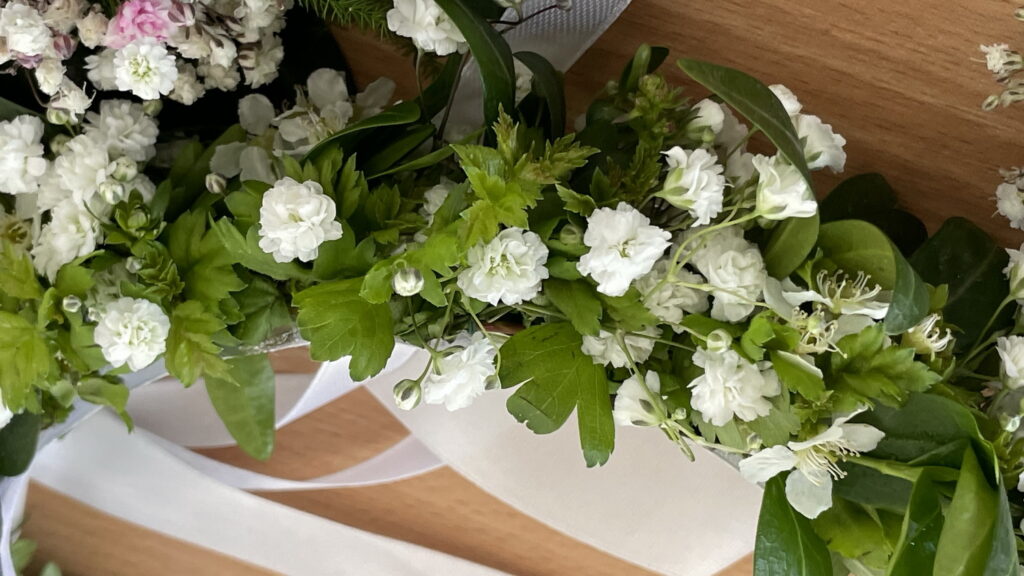 Uczestnicy ćwiczyli dobór roślin, budowanie rytmu, pracę na konstrukcji oraz wykończenia z użyciem wstążek i zieleni dekoracyjnej.