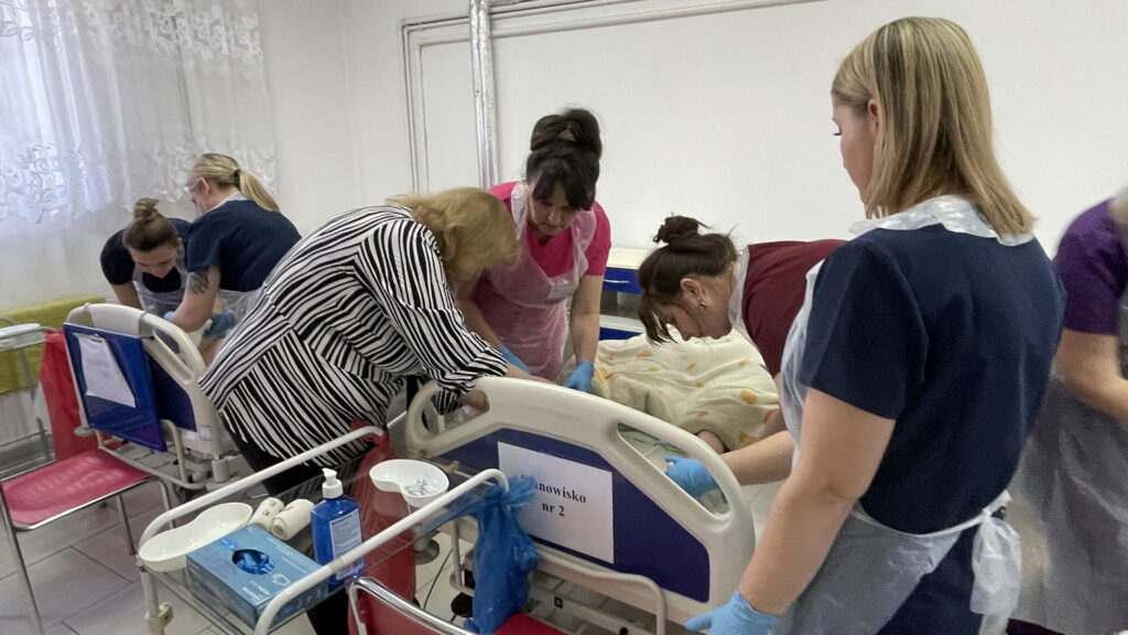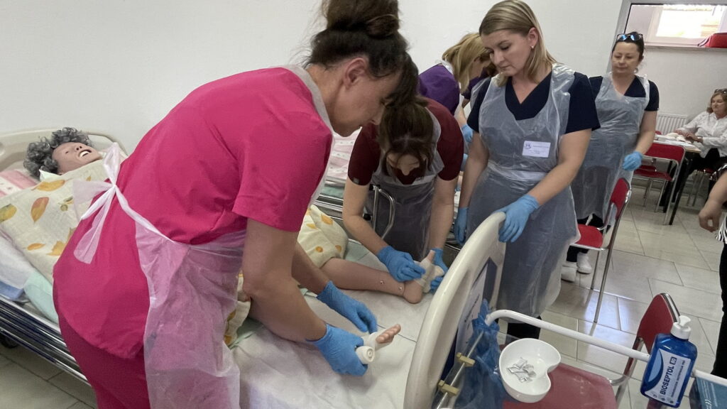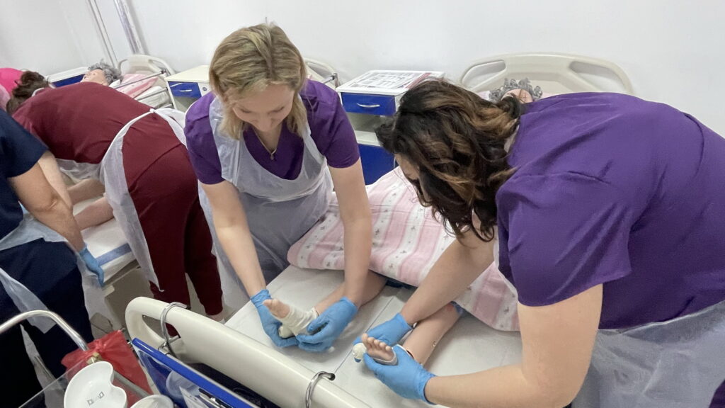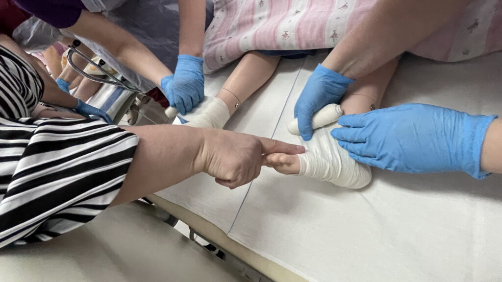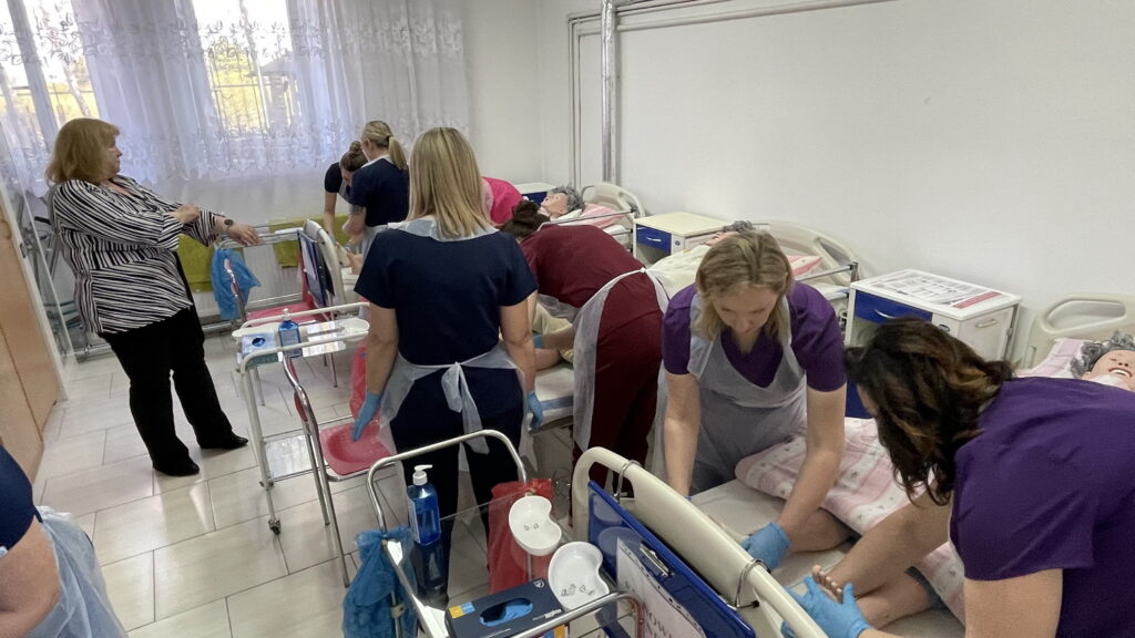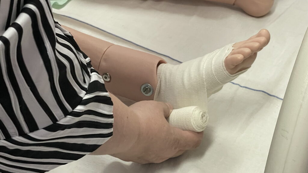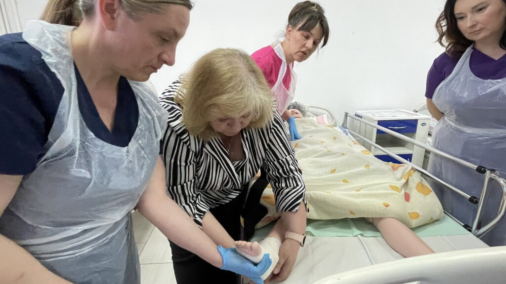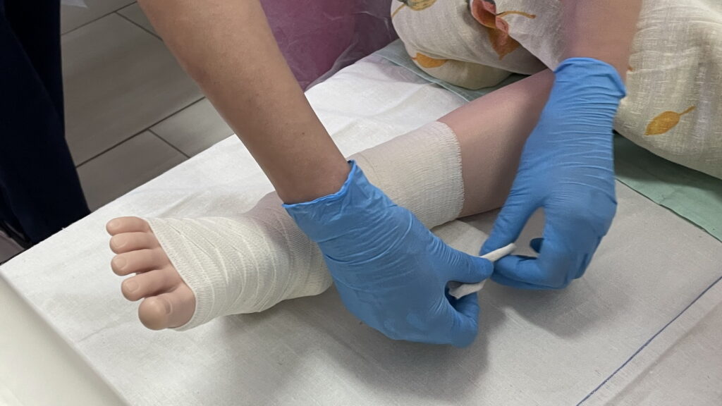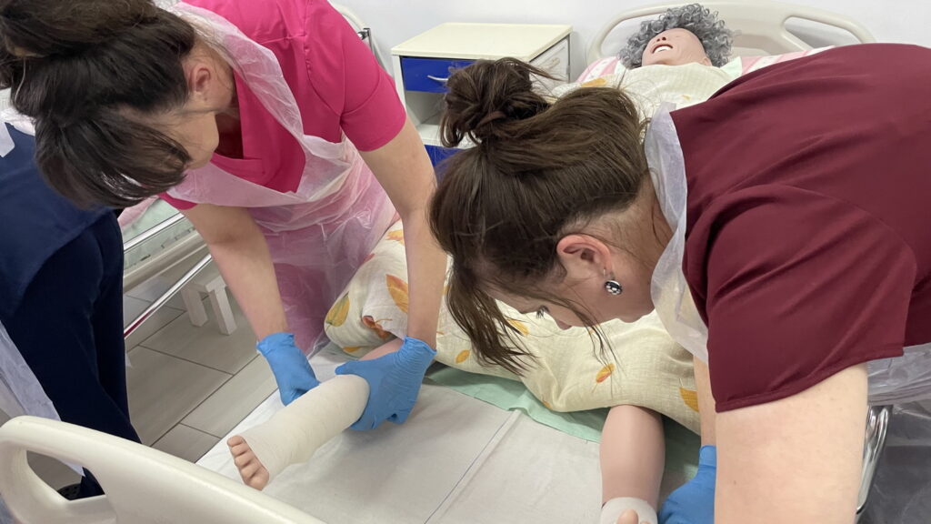 Słuchaczki kierunku opiekun medyczny na przedmiocie pracownia zabiegów medycznych ćwiczyły bandażowanie kompresyjne kończyn dolnych pod kierunkiem nauczycielek: Urszuli Rybak i Iwony Pawluczuk.