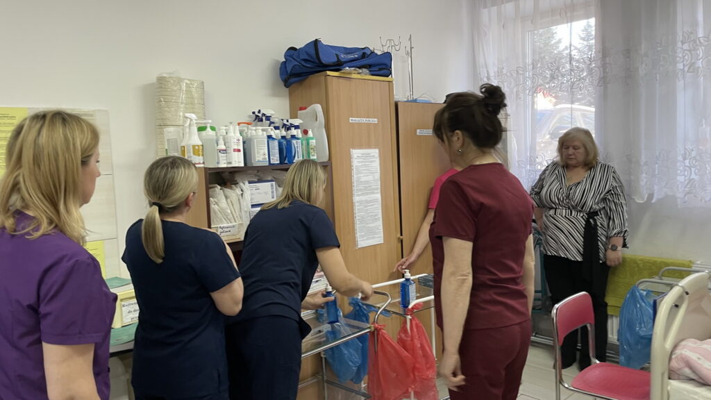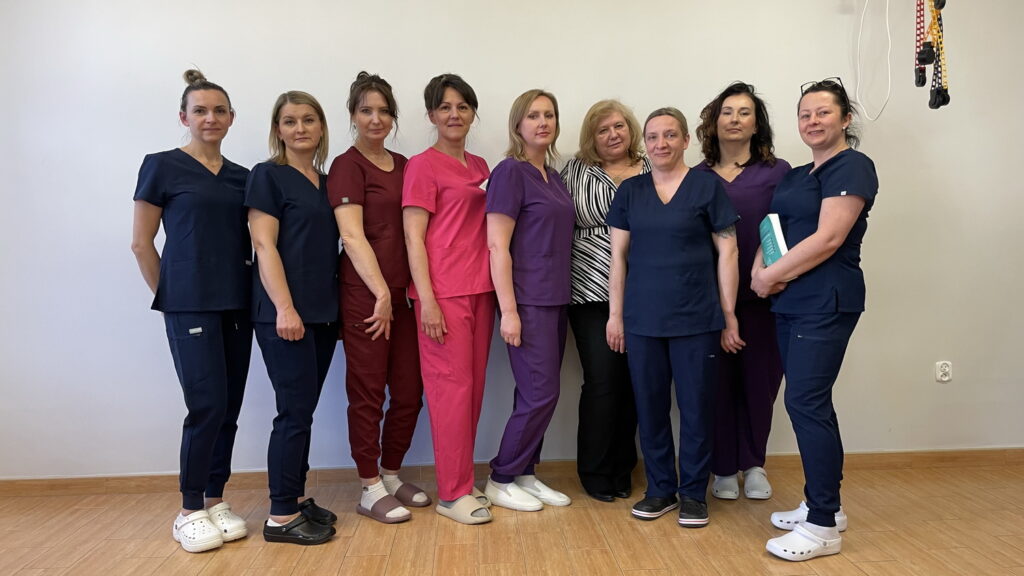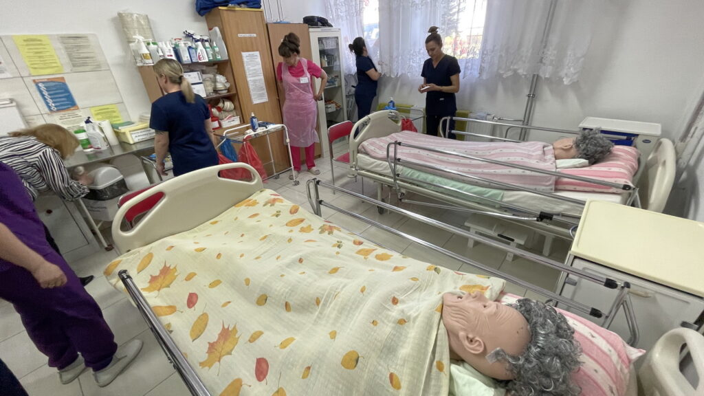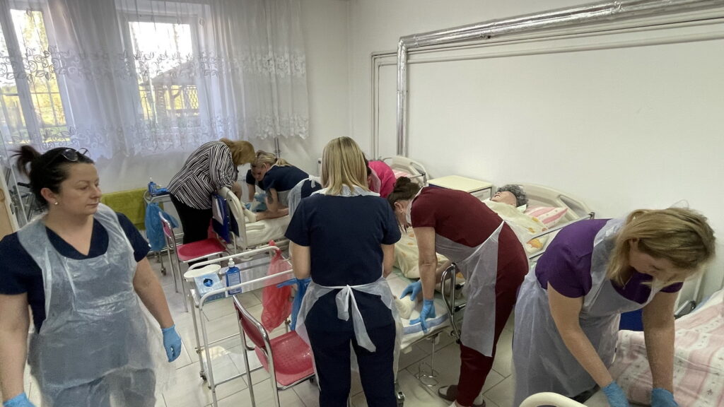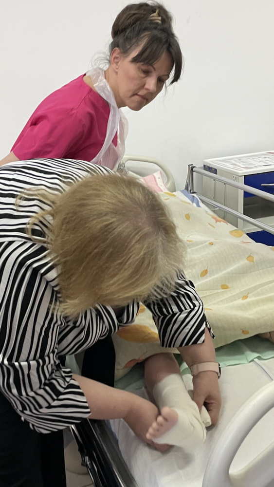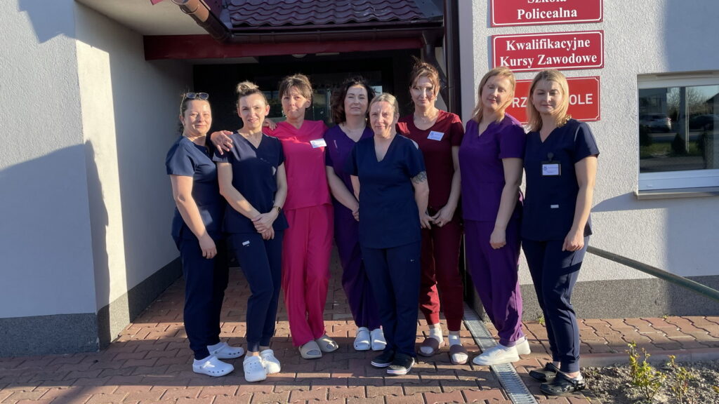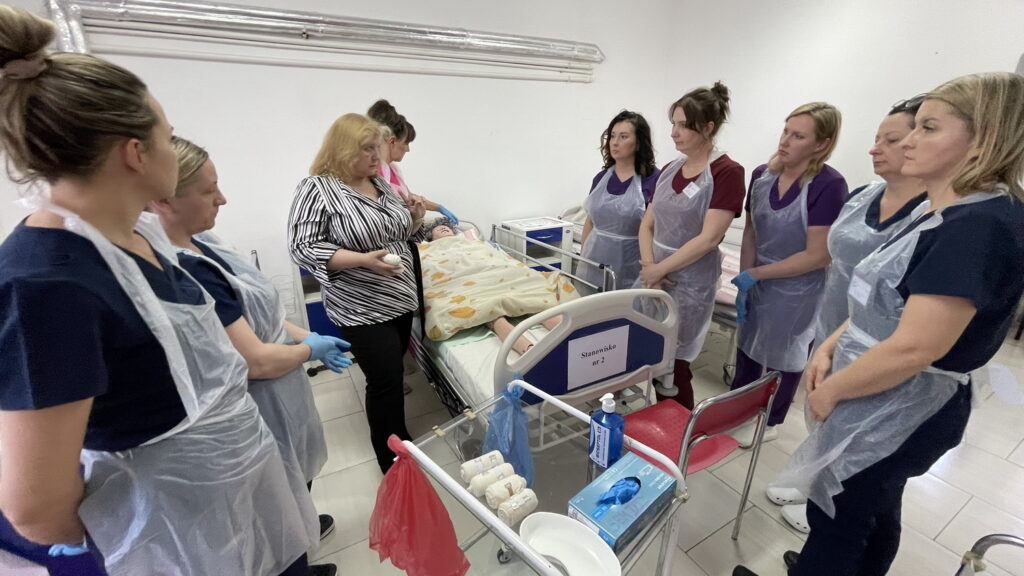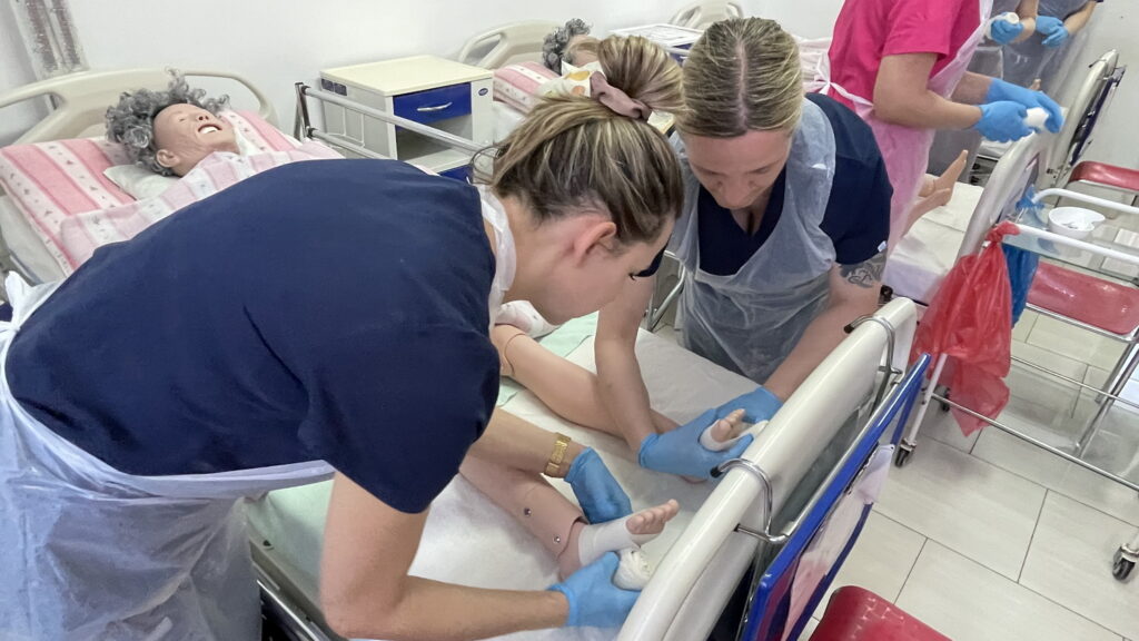 Słuchaczki kierunku opiekun medyczny na przedmiocie pracownia zabiegów medycznych ćwiczyły bandażowanie kompresyjne kończyn dolnych pod kierunkiem nauczycielek: Urszuli Rybak i Iwony Pawluczuk.